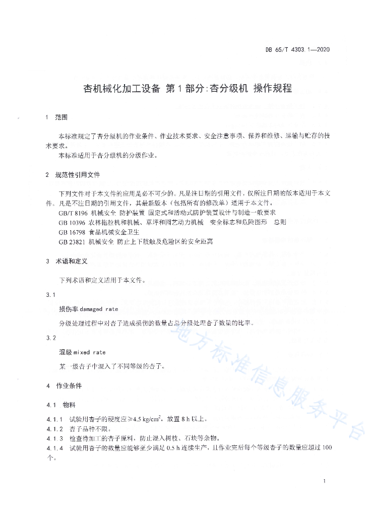 DB65/T 4303.1-2020 杏机械化加工设备 第1部分:杏分级机操作规程