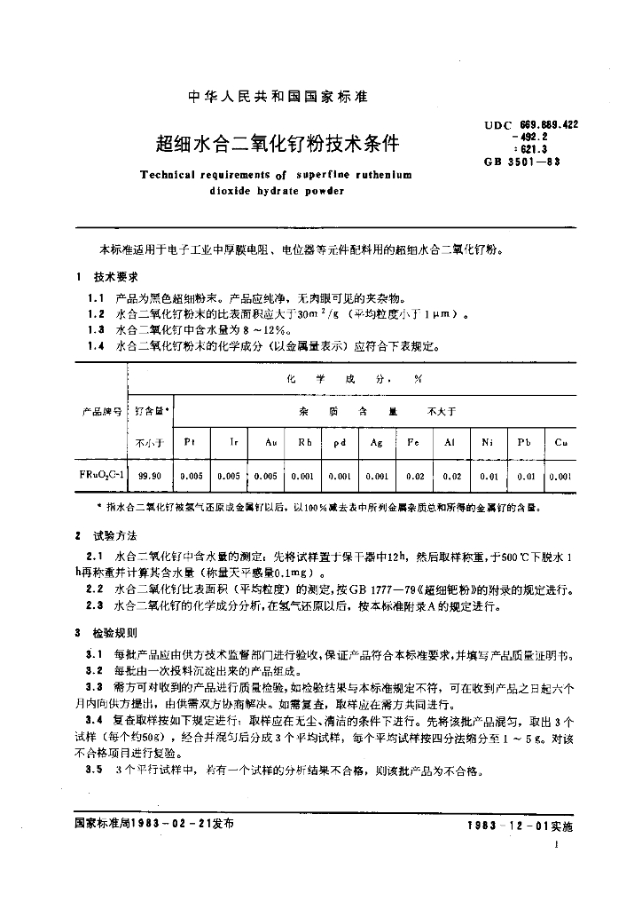 GB/T 3501-1983 超细水合二氧化钌粉技术条件