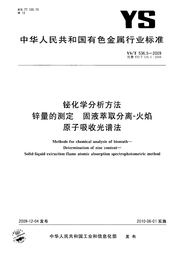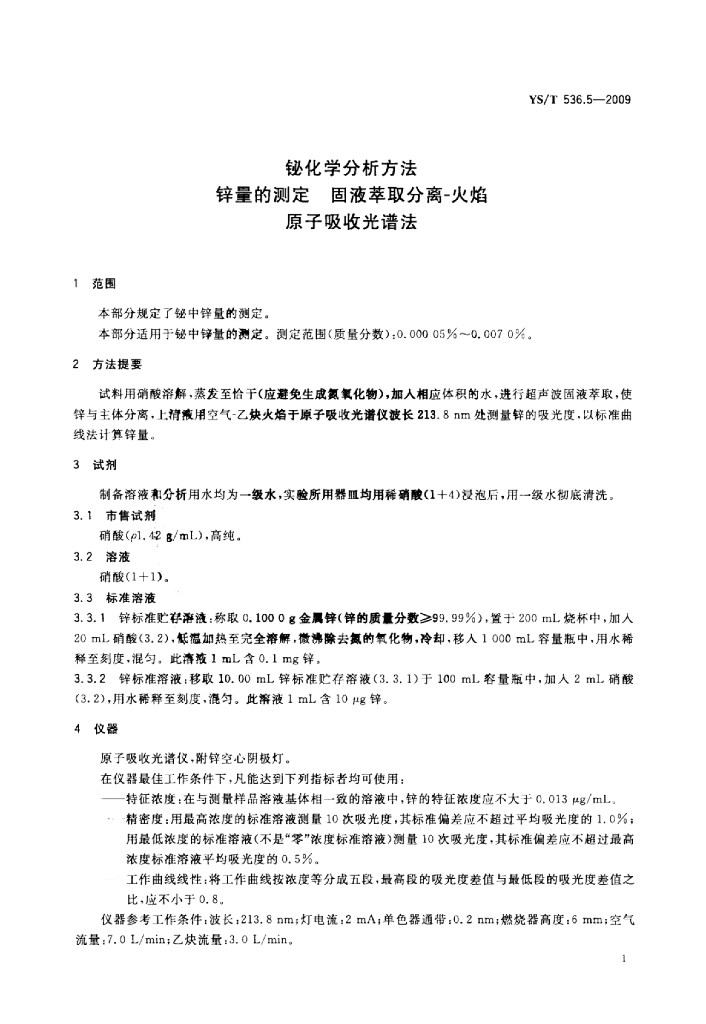 YS/T 536.5-2009 铋化学分析方法锌量的测定固液萃取分离-火焰原子吸收光谱法