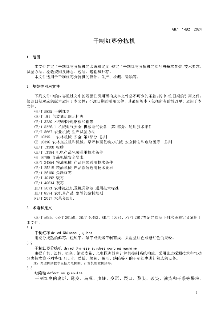 GH/T 1482-2024 干制红枣分拣机
