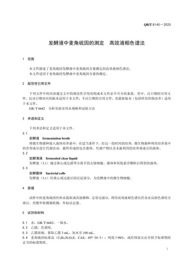 QB/T 8140-2025 发酵液中麦角硫因的测定 高效液相色谱法