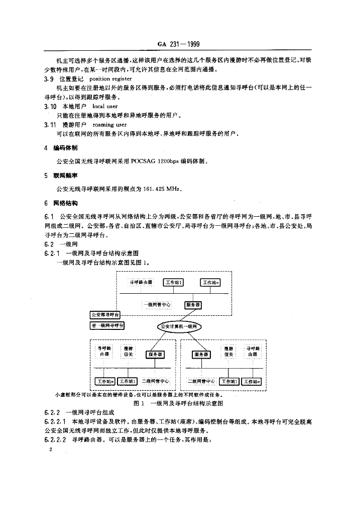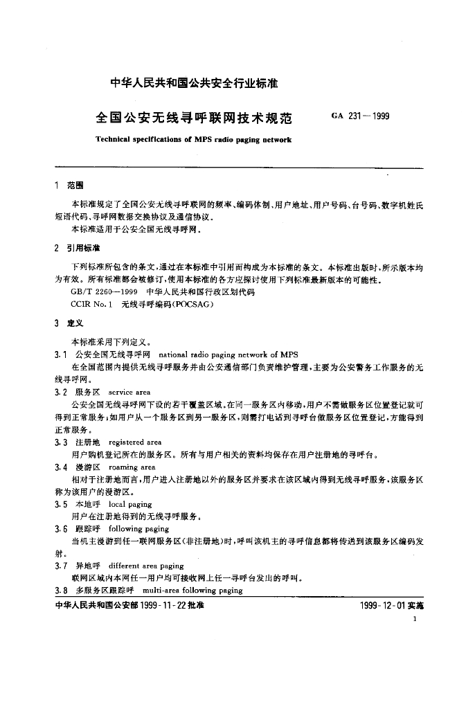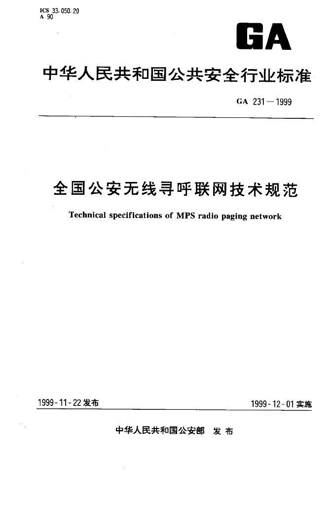 GA 231-1999 全国公安无线寻呼联网技术规范