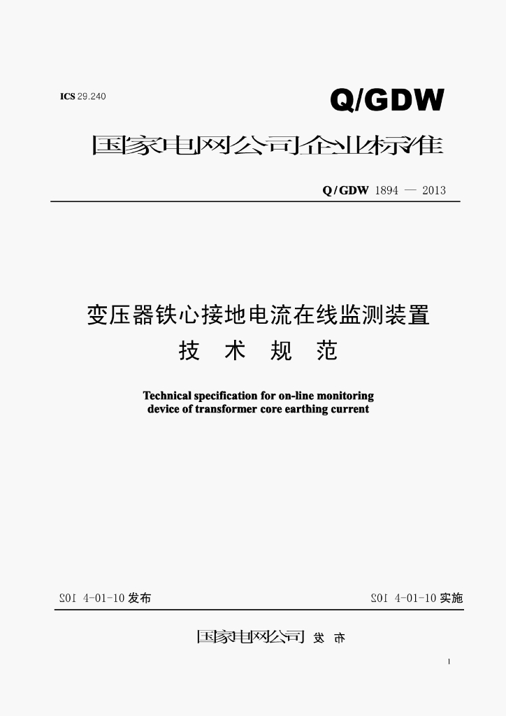 Q/GDW 1894-2013 变压器铁心接地电流在线监测装置技术规范