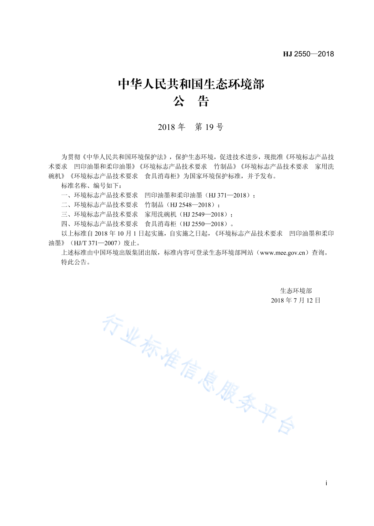 HJ 2550-2018 环境标志产品技术要求 食具消毒柜