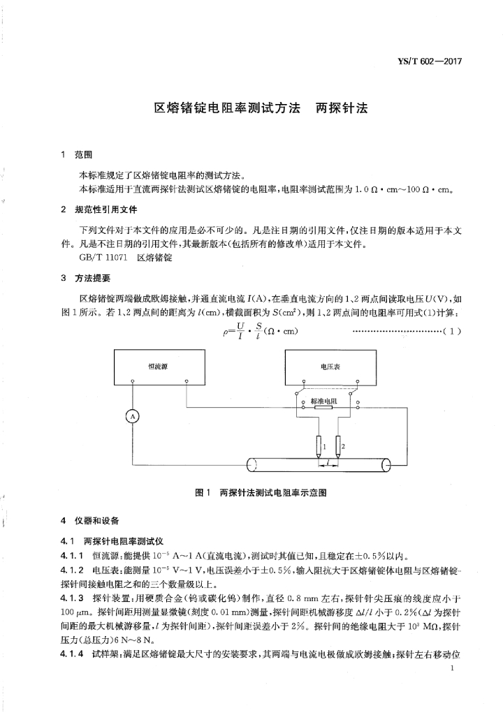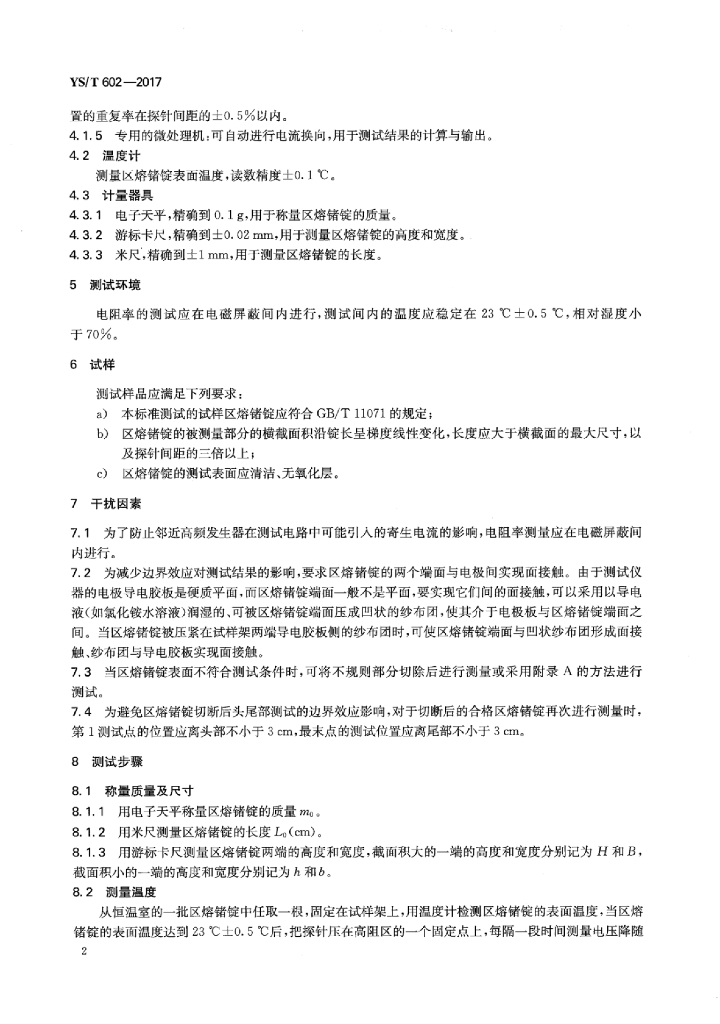 YS/T 602-2017 区熔锗锭电阻率测试方法两探针法