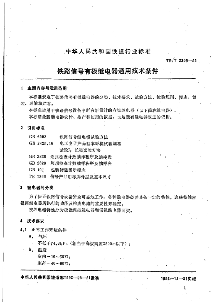 TB/T 2309-1992 铁路信号有极继电器通用技术条件