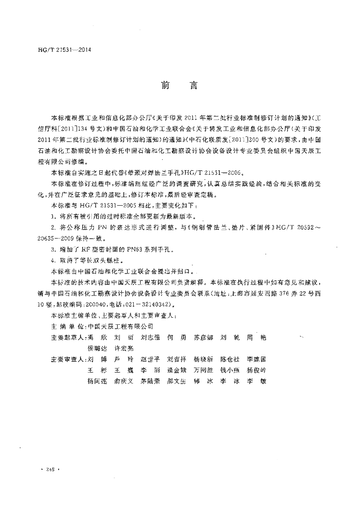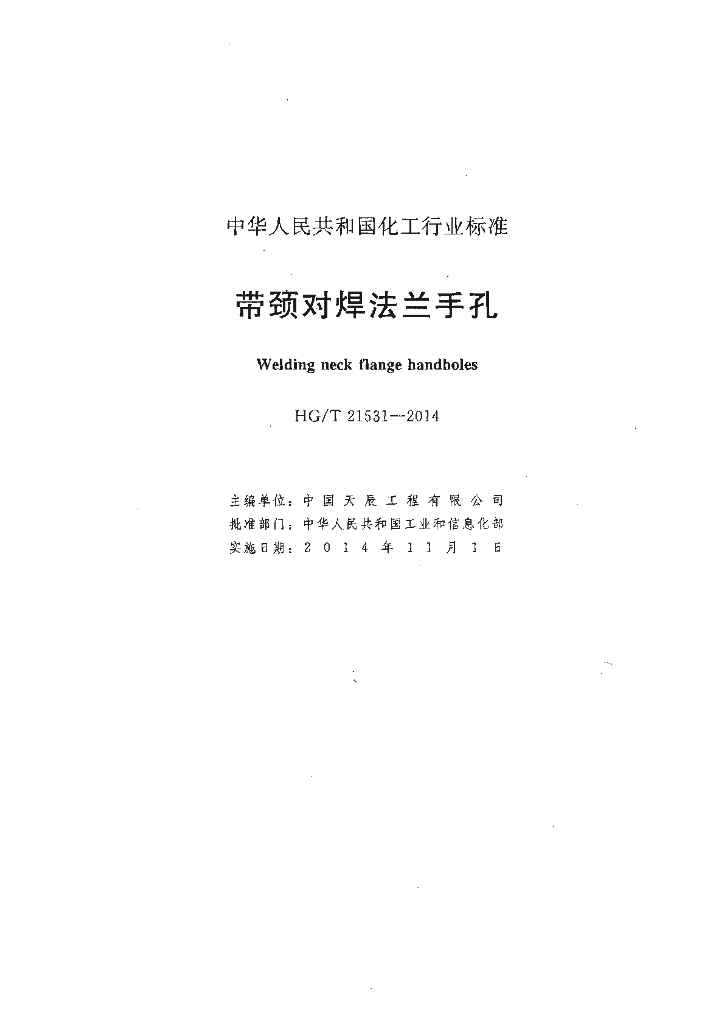 HG/T 21531-2014 代替 HG/T 21531-2005 带颈对焊法兰手孔