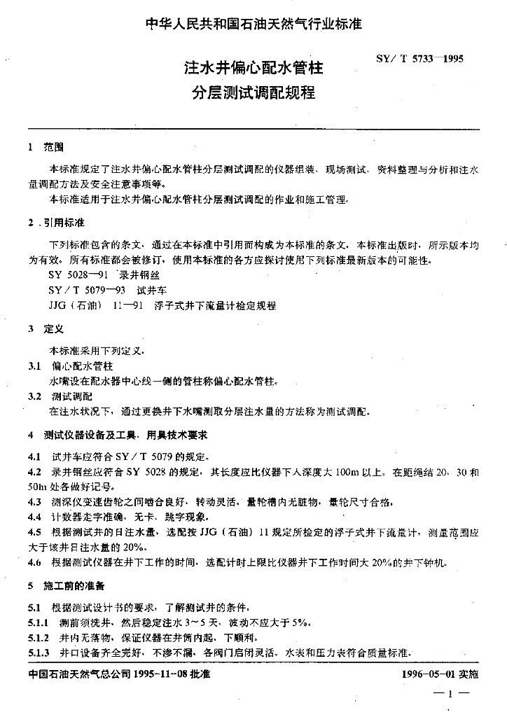SY/T 5733-1995 注水井偏心配水管柱分层测试调配规程