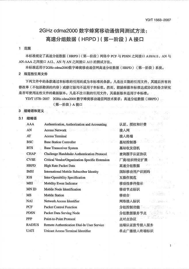 YD/T 1563-2007 2GHz cdma2000数字蜂窝移动通信网测试方法:高速分组数据(HRPD)(第一阶段)A接口