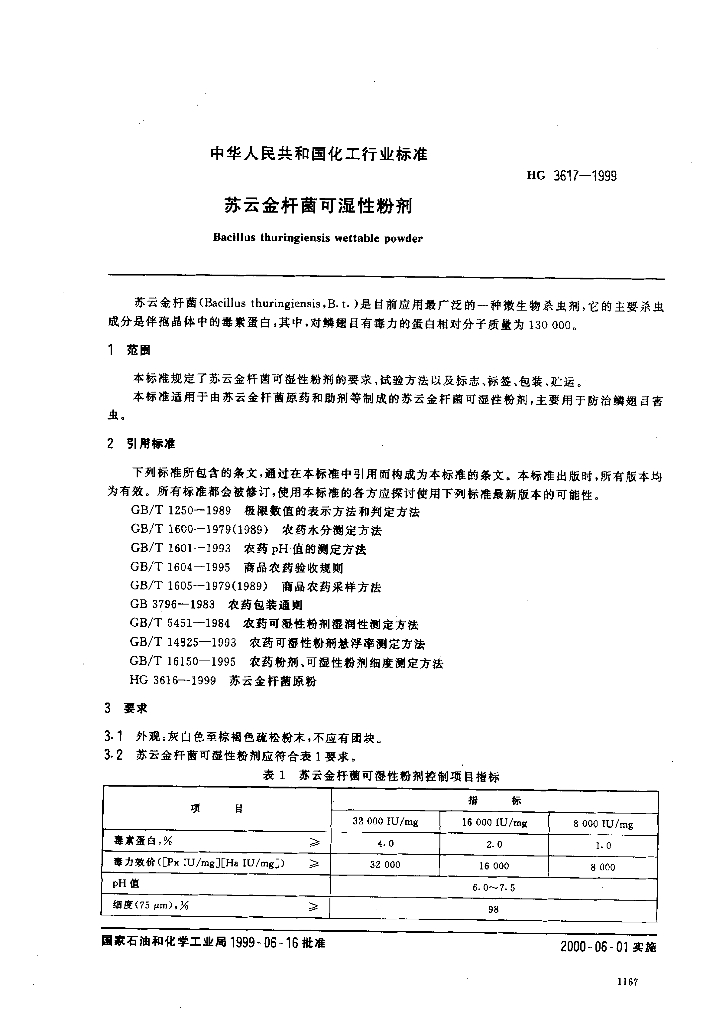 HG/T 3617-1999 苏云金杆菌可湿性粉剂