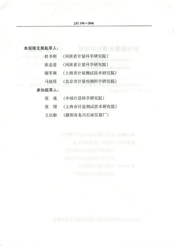 杜书利(河南省计量科学研究院)、张志清(河南省计量科学研究院)、谢军燕(上海市计量测试技术研究院)、马骁勇(北京市计量检测科学研究院)、张珑(中国计量科学研究院)、张缨(上海市计量测试技术研究院)、王庆彬(濮阳市龙兴石油仪器厂)