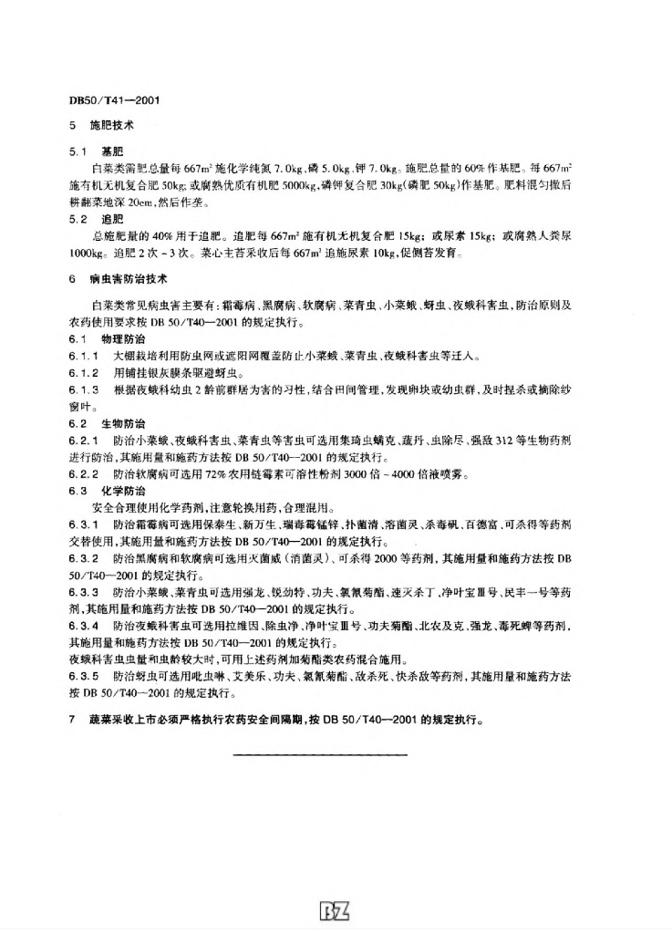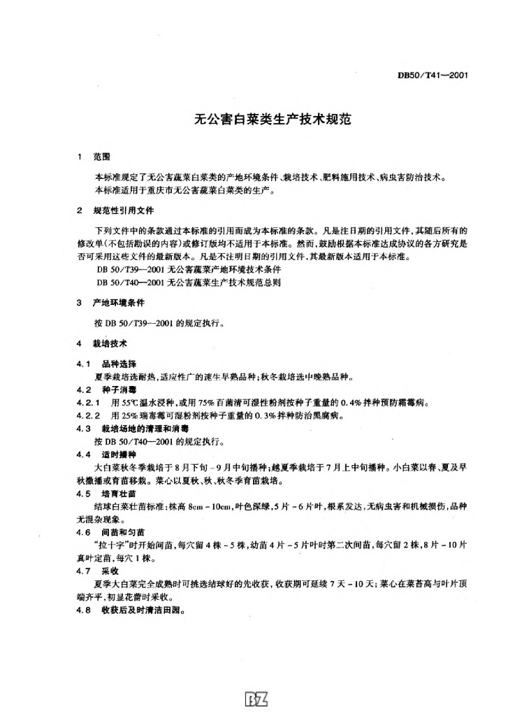 DB50/T 41-2001 无公害蔬菜白菜类生产技术规范