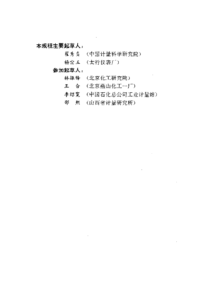 翟秀贞(中国计量科学研究院)、杨宗玉(太行仪表厂)、林振锋(北京化工研究院)、王合(北京燕山化工一厂)、李绍宽(中国石化总公司工业计量站)、邵熙(山西省计量研究所)