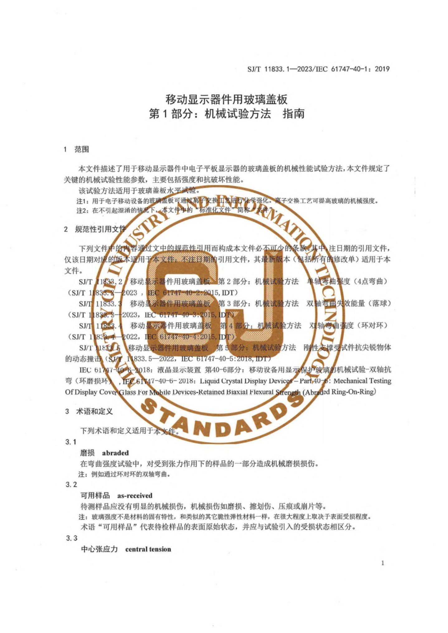 SJ/T 11833.1-2023/IEC 61747-40-1:2019 移动显示器件用玻璃盖板 第1部分:机械试验方法 指南