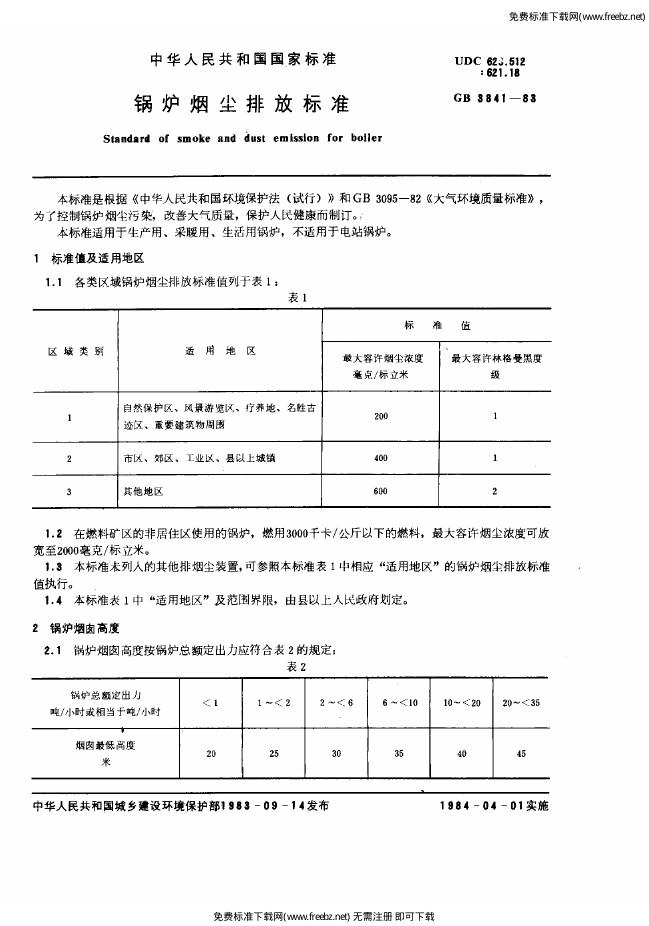 GB/T 3841-1983 锅炉烟尘排放标准