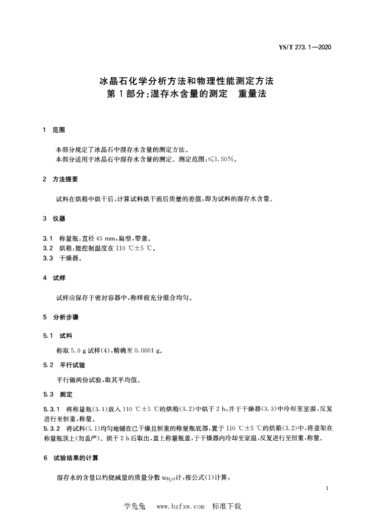 YS/T 273.1-2020 冰晶石化学分析方法和物理性能测定方法 第1部分:湿存水含量的测定 重量法