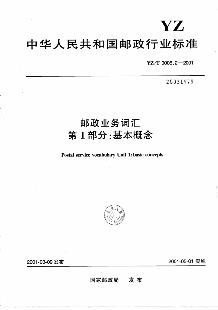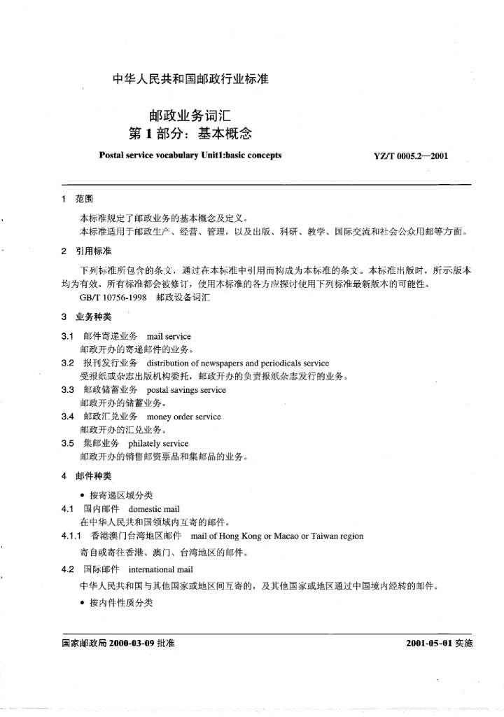 YZ/T 0005.2-2001 邮政业务词汇 第1部分:基本概念