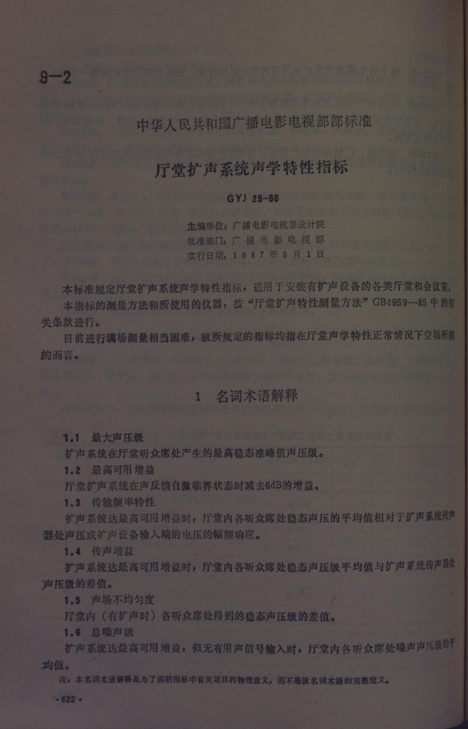 GYJ 25-1986 厅堂扩声系统声学特性指标
