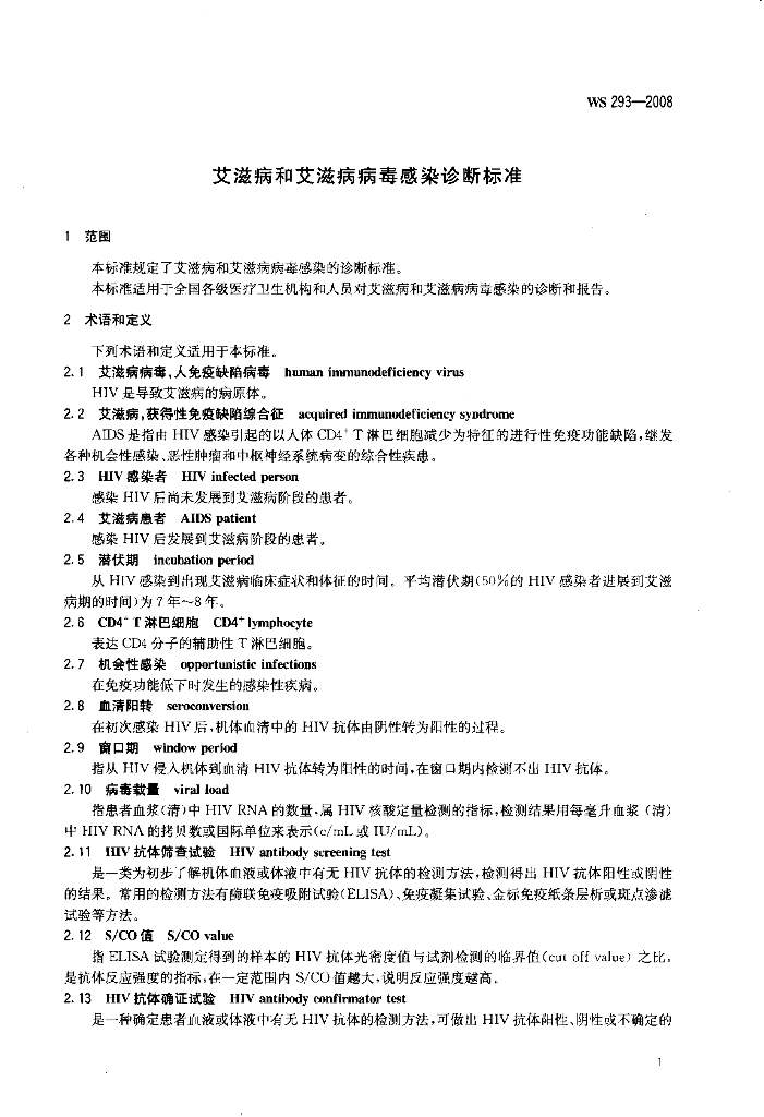 WS 293-2008 艾滋病和艾滋病病毒感染诊断标准