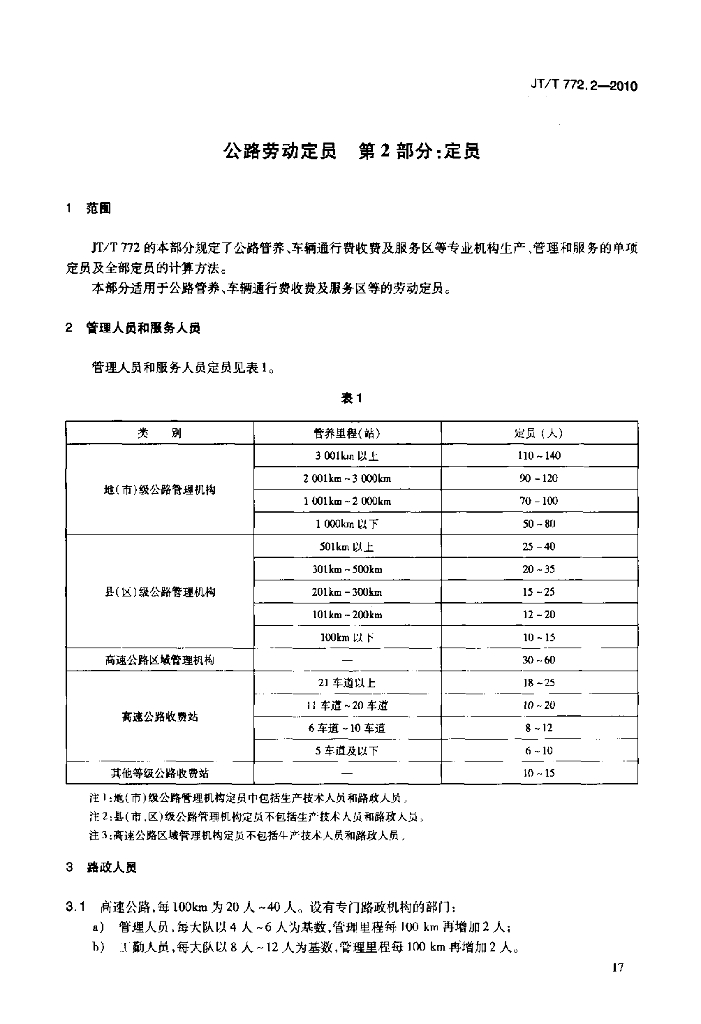 JT/T 772.2-2010 公路劳动定员 第2部分:定员