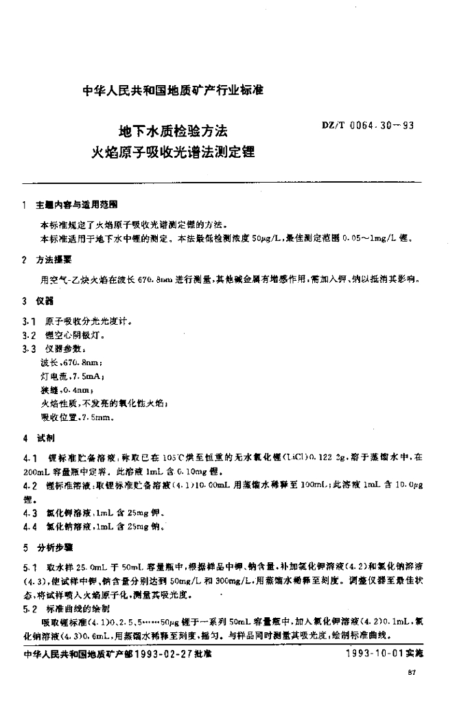 DZ/T 0064.30-1993 地下水质检验方法火焰原子吸收光谱法测定锂