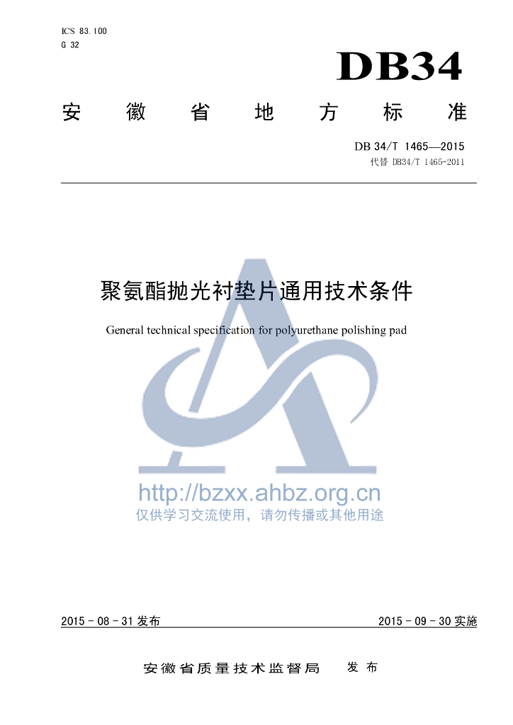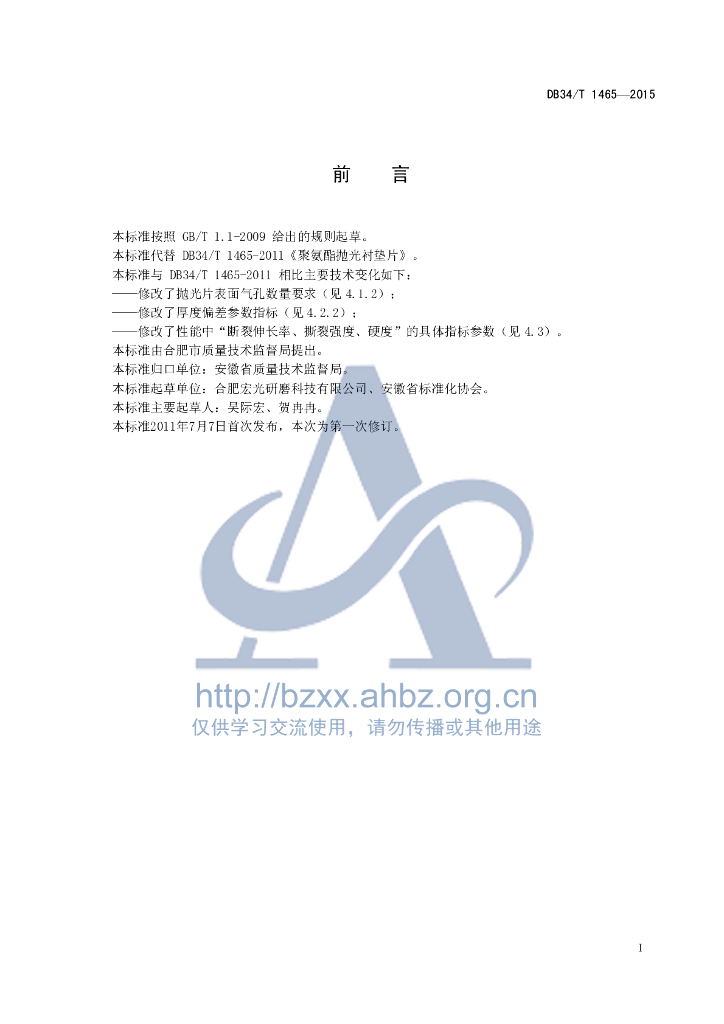 DB34/T 1465-2015 聚氨酯抛光衬垫片通用技术条件