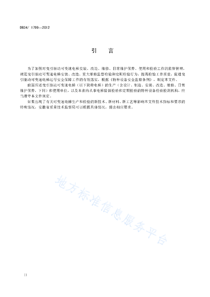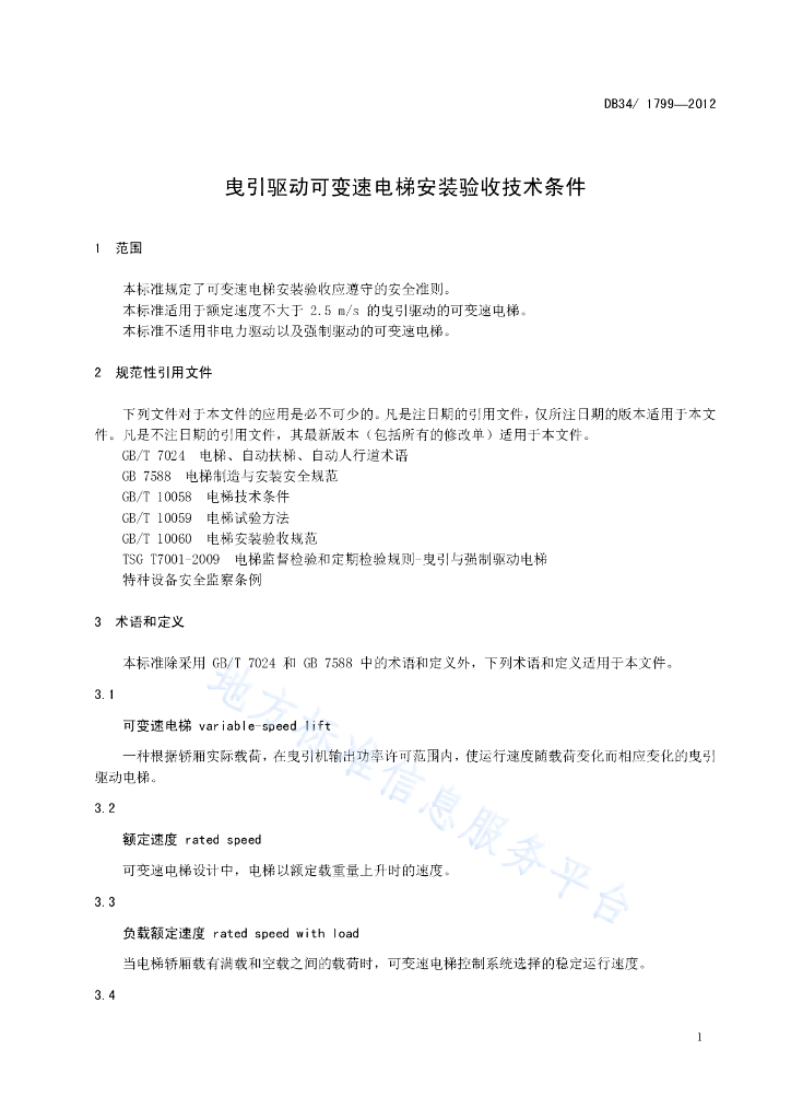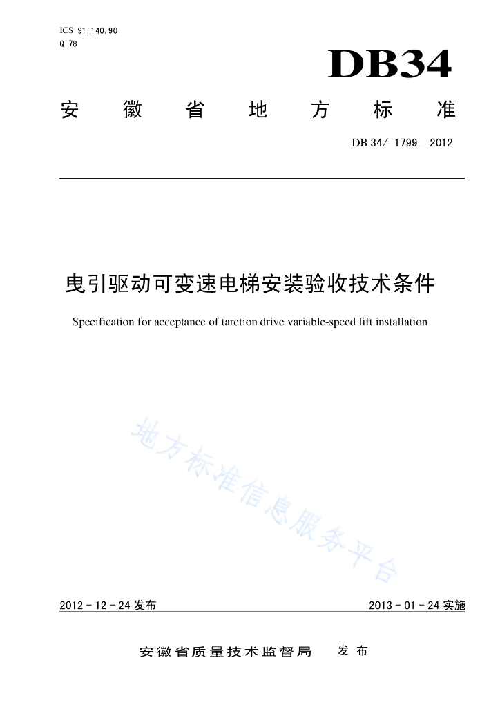 DB34/ 1799-2012 曳引驱动可变速电梯安装验收技术条件