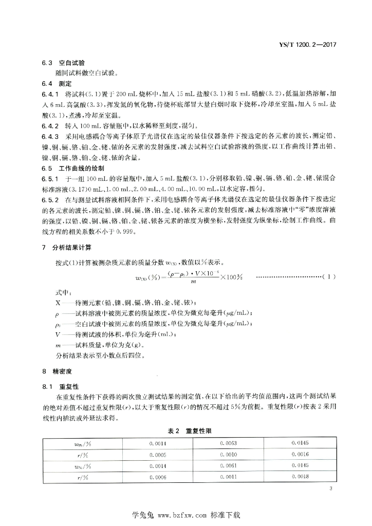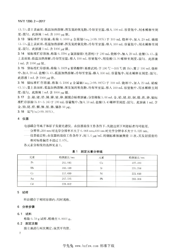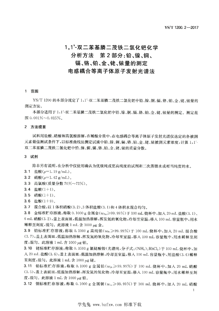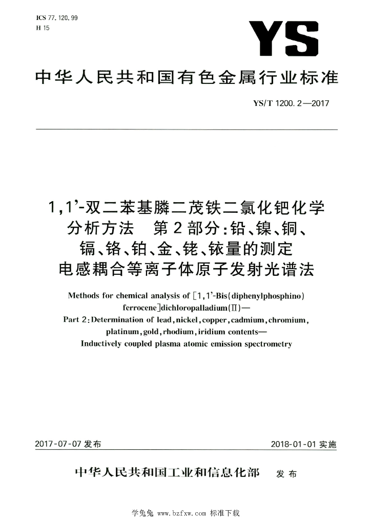 YS/T 1200.2-2017 1,1-双二苯基膦二茂铁二氯化钯化学分析方法 第2部分:铅、镍、铜、镉、铬、铂、金、铑、铱量的测定 电感耦合等离子体原子发射光谱法
