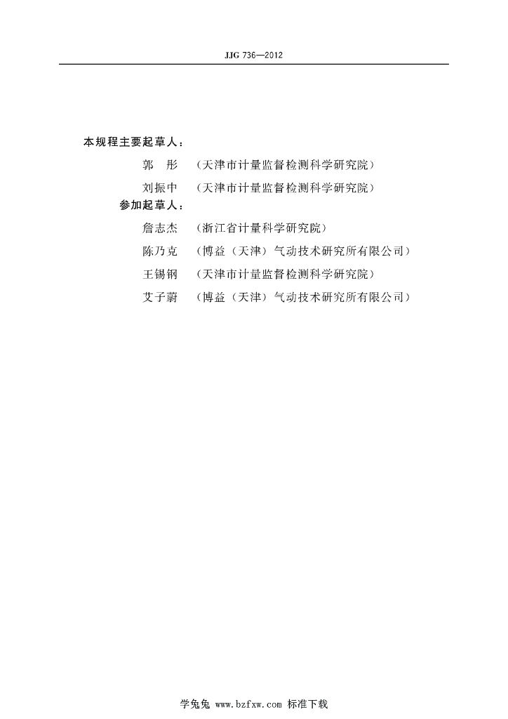 郭彤(天津市计量监督检测科学研究院)、刘振中(天津市计量监督检测科学研究院)、詹志杰(浙江省计量科学研究院)、陈乃克(博益(天津)气动技术研究所有限公司)、王锡钢(天津市计量监督检测科学研究院)、艾子蔚(博益(天津)气动技术研究所有限公司)