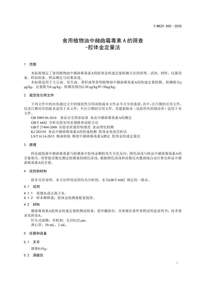 T/NXZX 050-2025 食用植物油中赭曲霉毒素A的筛查 -胶体金定量法