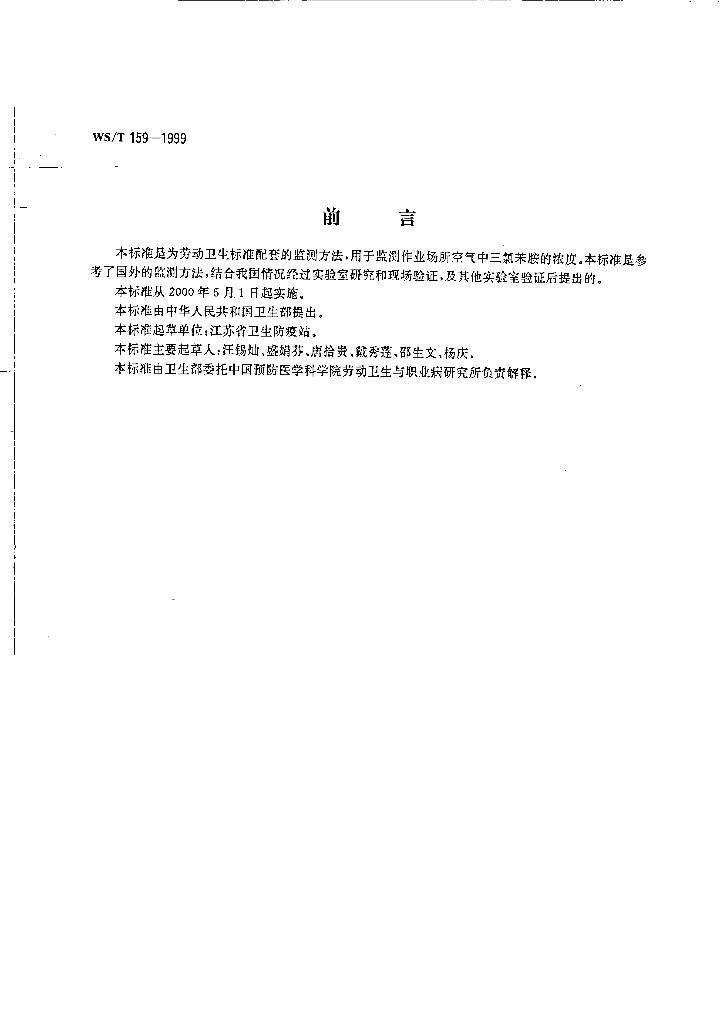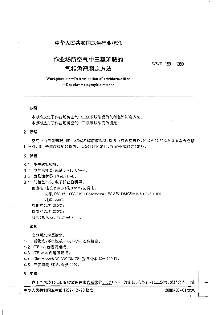 WS/T 159-1999 作业场所空气中三氯苯胺的气相色谱测定方法