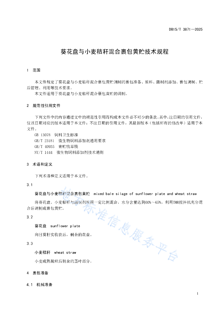 DB15/T 3871-2025 葵花盘与小麦秸秆混合裹包黄贮技术规程