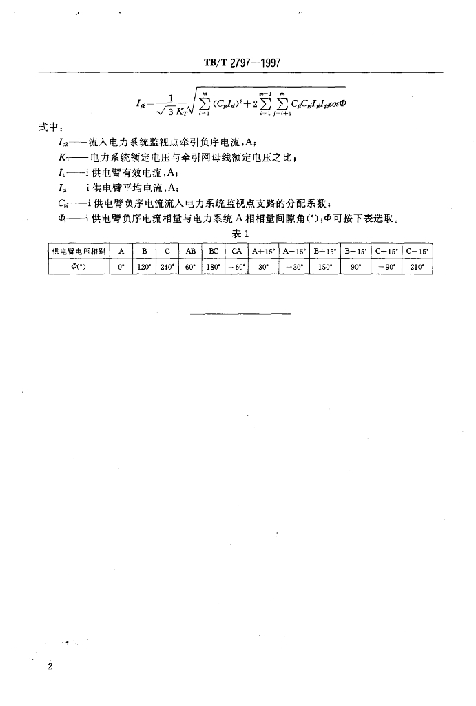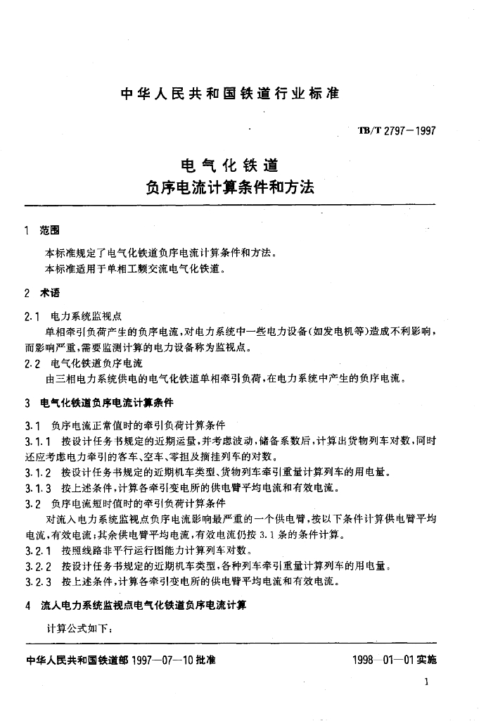 TB/T 2797-1997 电气化铁道负序电流计算条件和方法