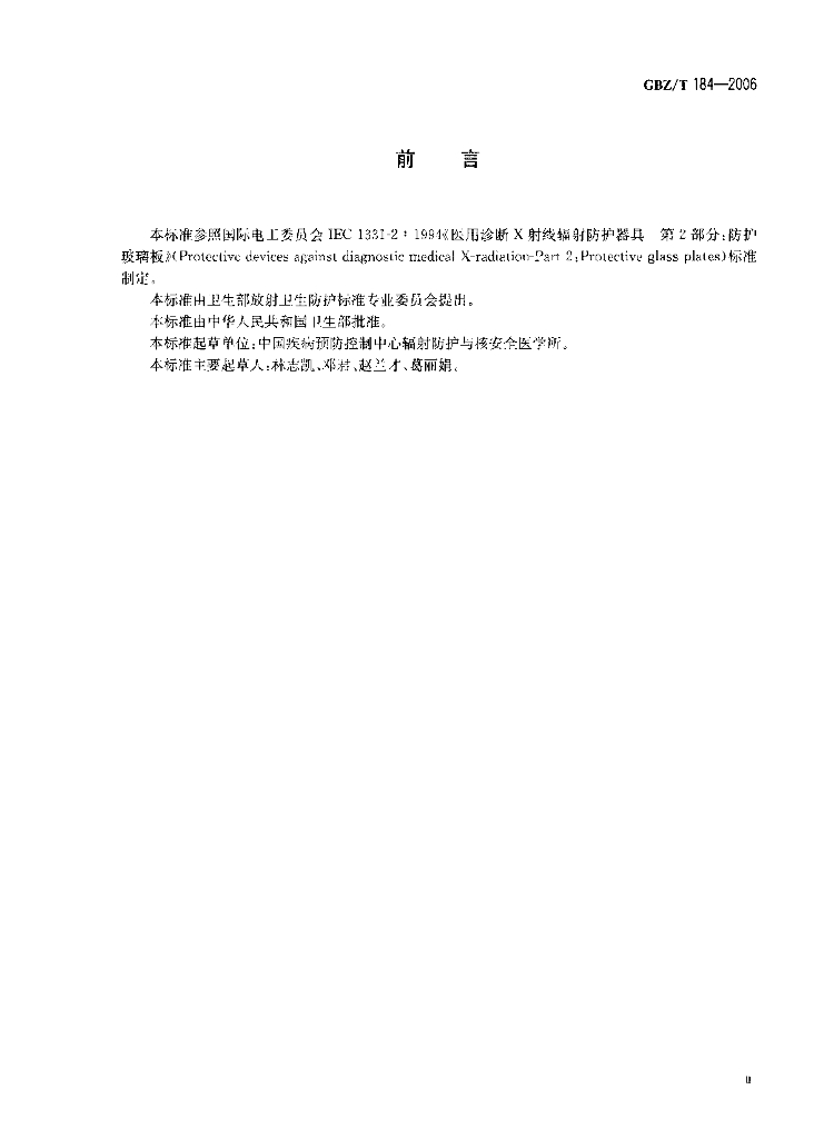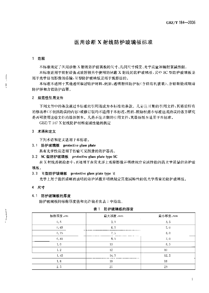 GBZ/T 184-2006 医用诊断X射线防护玻璃板标准