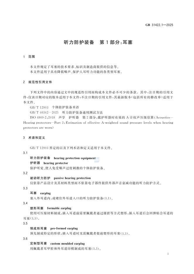 GB 31422.1-2025 听力防护装备 第1部分:耳塞