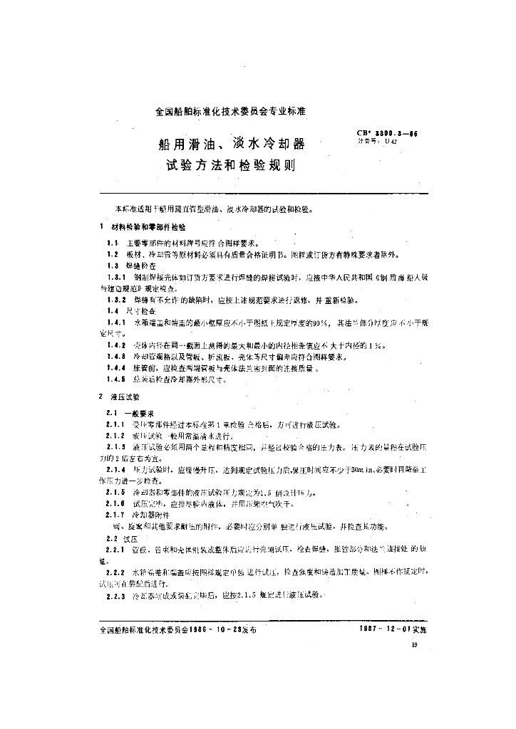 CB 3300.3-1986 船用滑油、淡水冷却器 试验方法和检验规则