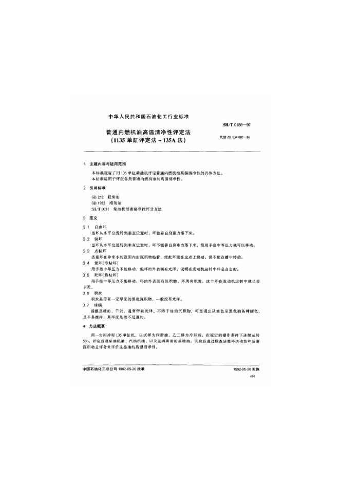 SH/T 0186-1992 普通内燃机油高温清净性评定法1135单缸评定法-135A法