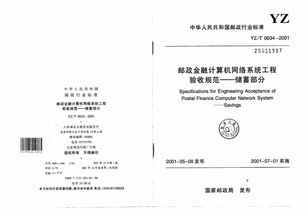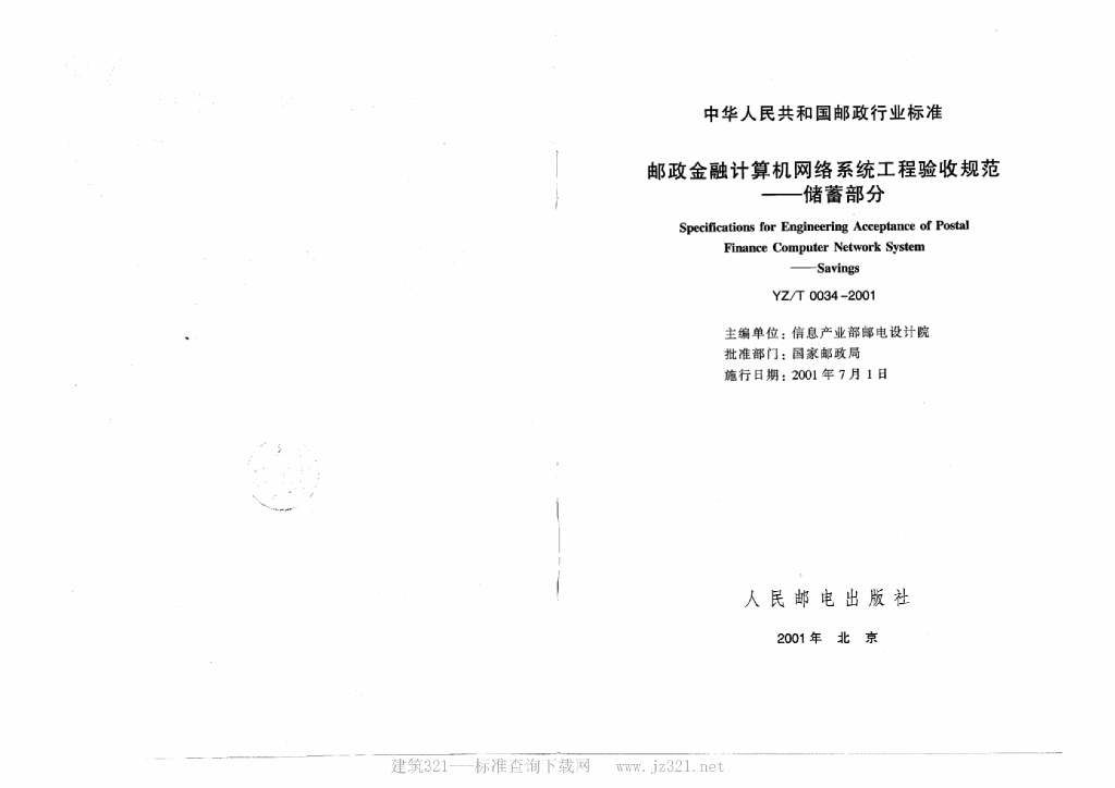 YZ/T 0034-2001 邮政金融计算机网络系统工程验收规范—储蓄部分
