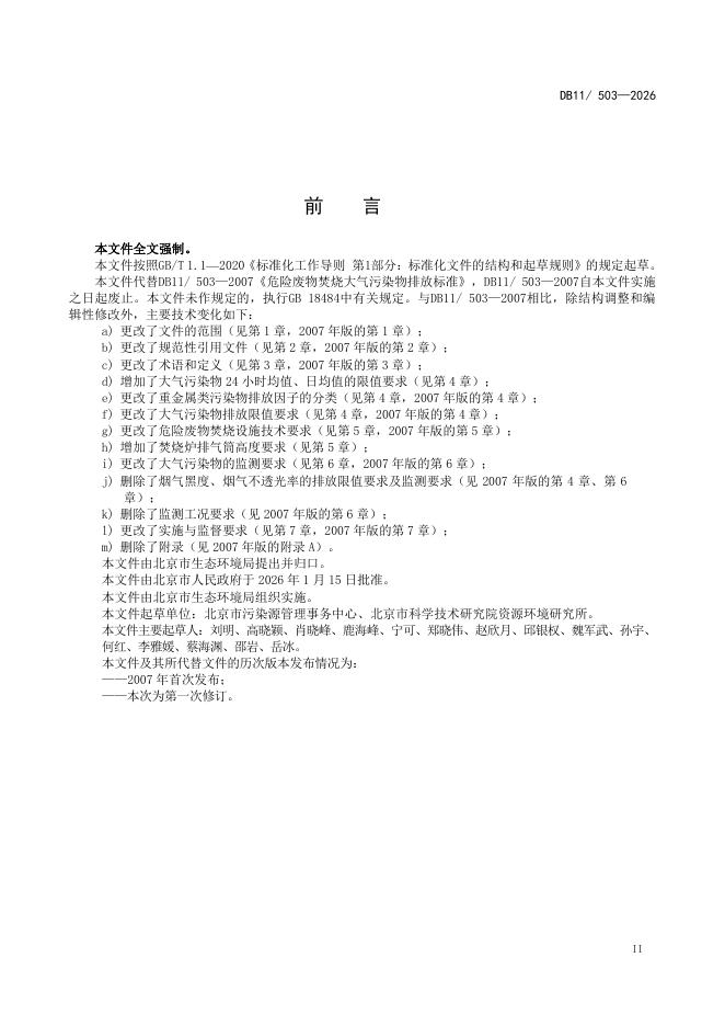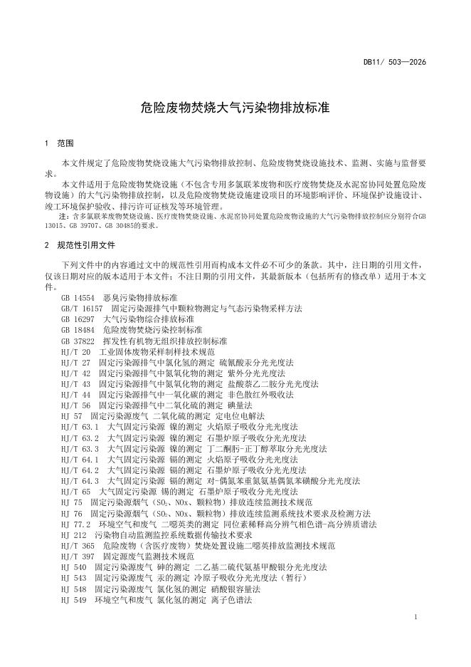 DB11/ 503-2026 危险废物焚烧大气污染物排放标准