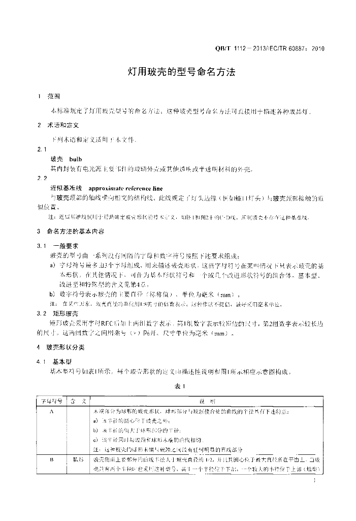QB/T 1112-2013/IEC/TR 60887: 2010 灯用玻壳的型号命名方法