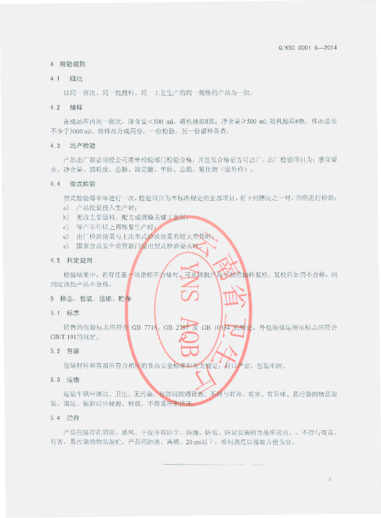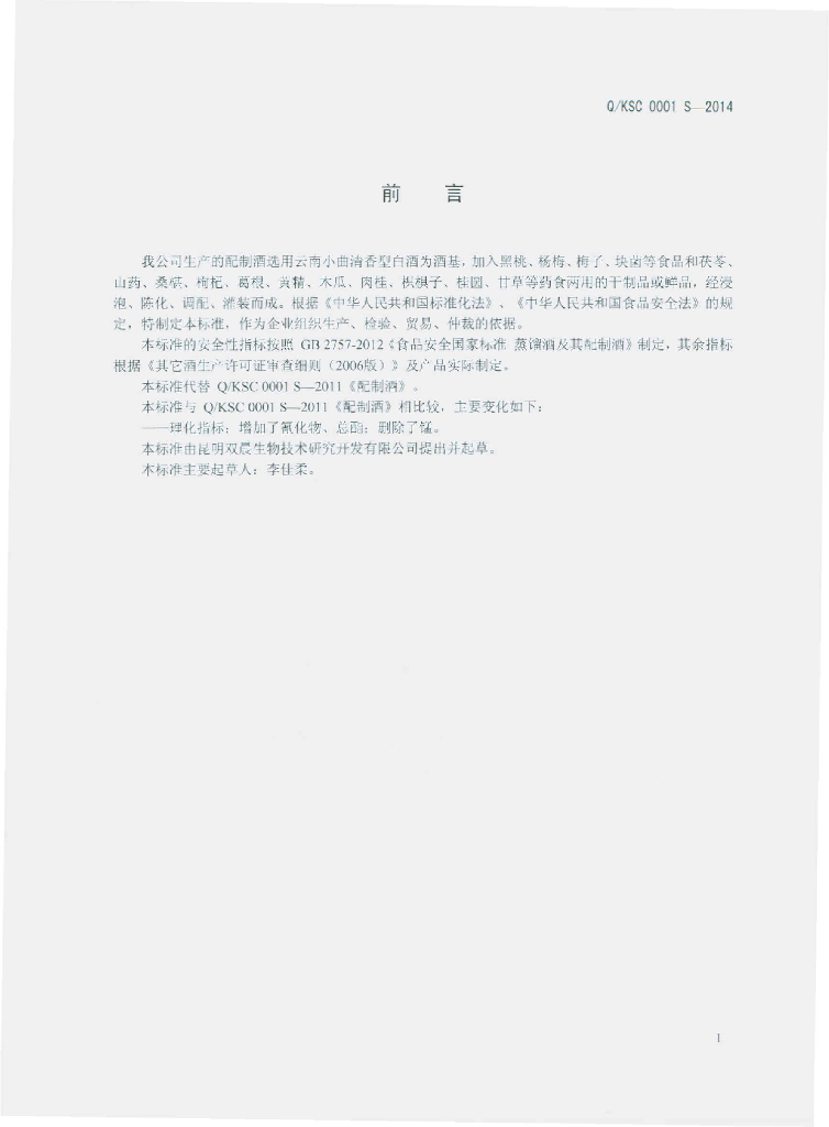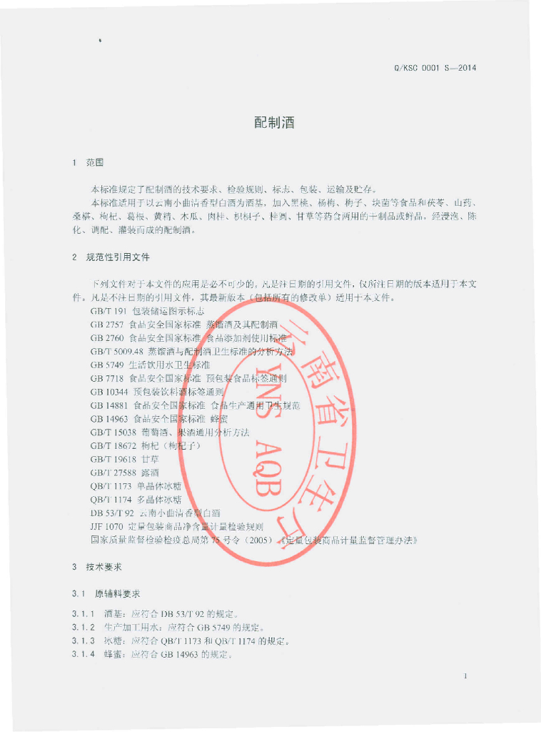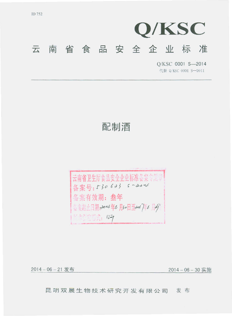 Q/KSC 0001S-2014 昆明双晨生物技术研究开发有限公司 配制酒