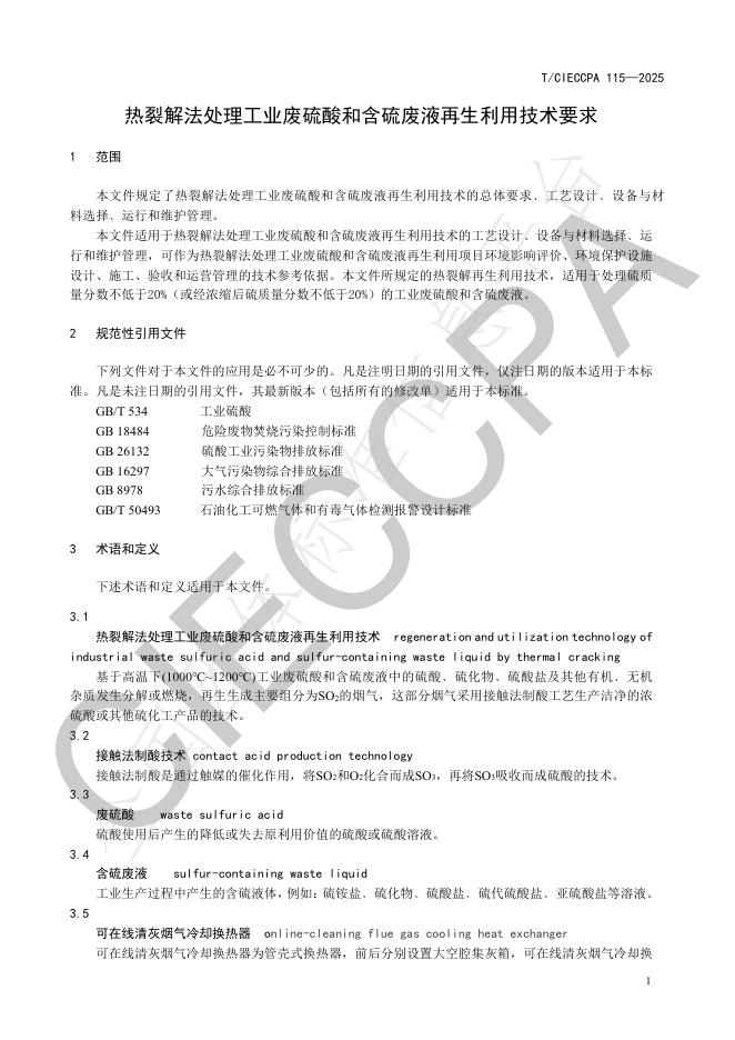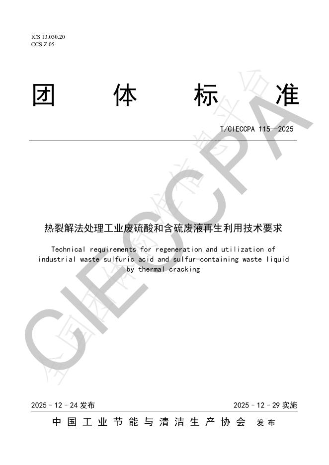 T/CIECCPA 115-2025 热裂解法处理工业废硫酸和含硫废液再生利用技术要求