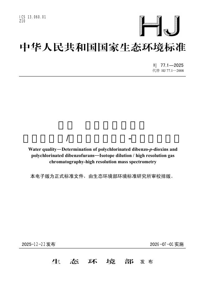 HJ 77.1-2025 水质 二噁英类的测定 同位素稀释/高分辨气相色谱-高分辨质谱法