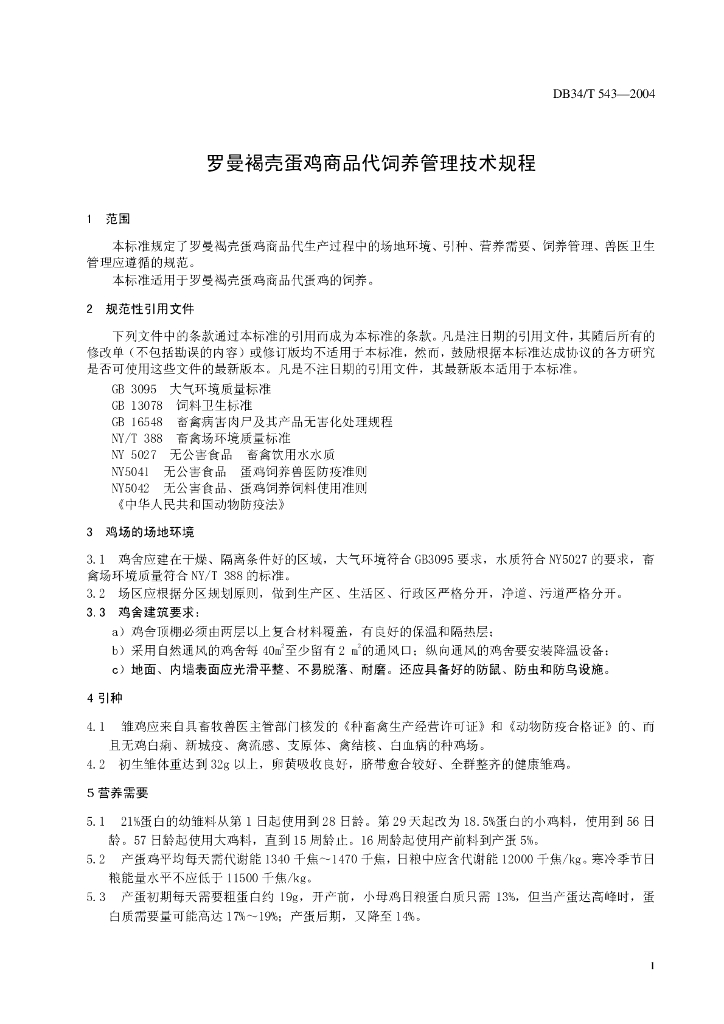 DB34/T 543-2005 罗曼褐壳蛋鸡商品代饲养管理技术规程