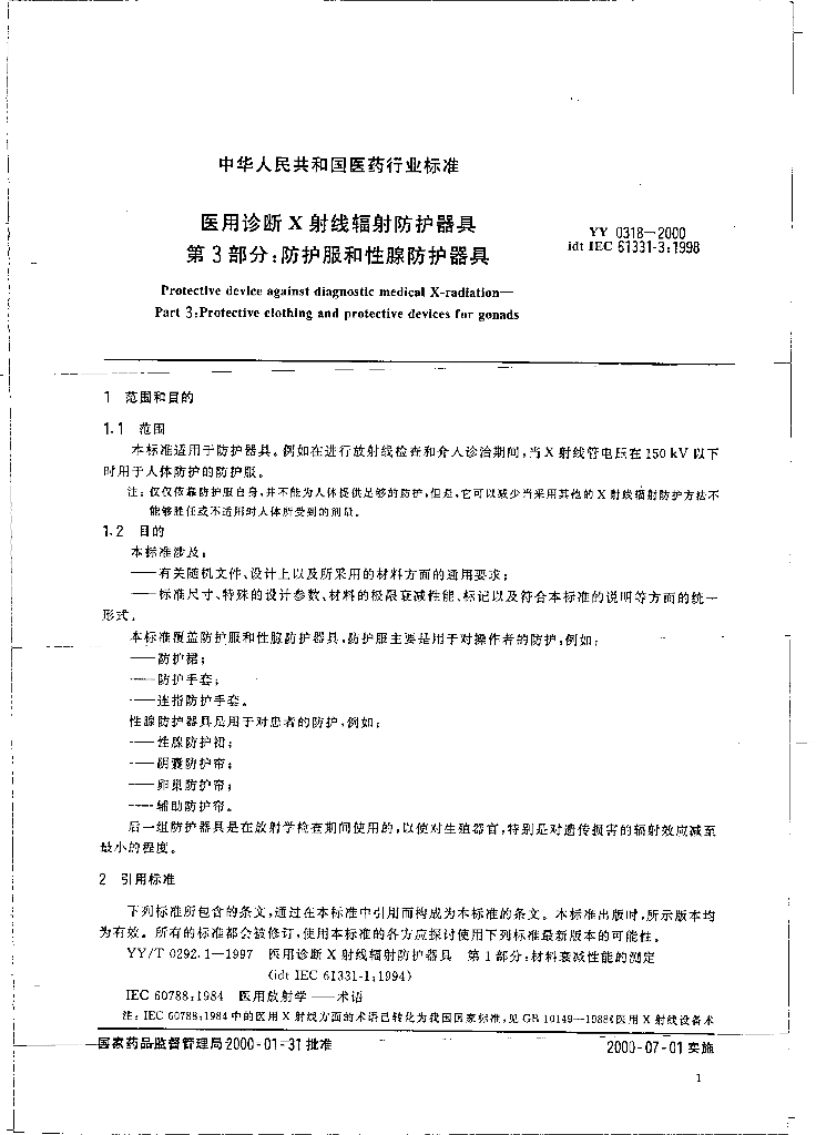 YY 0318-2000 医用诊断X射线辐射防护器具 第3部分:防护服和性腺防护器具
