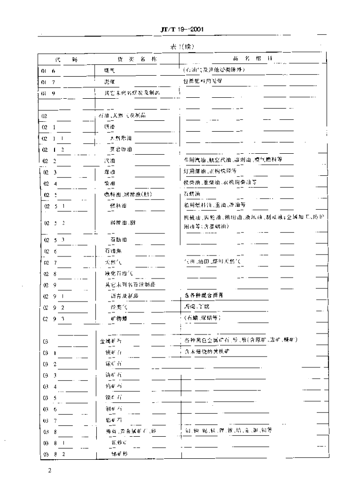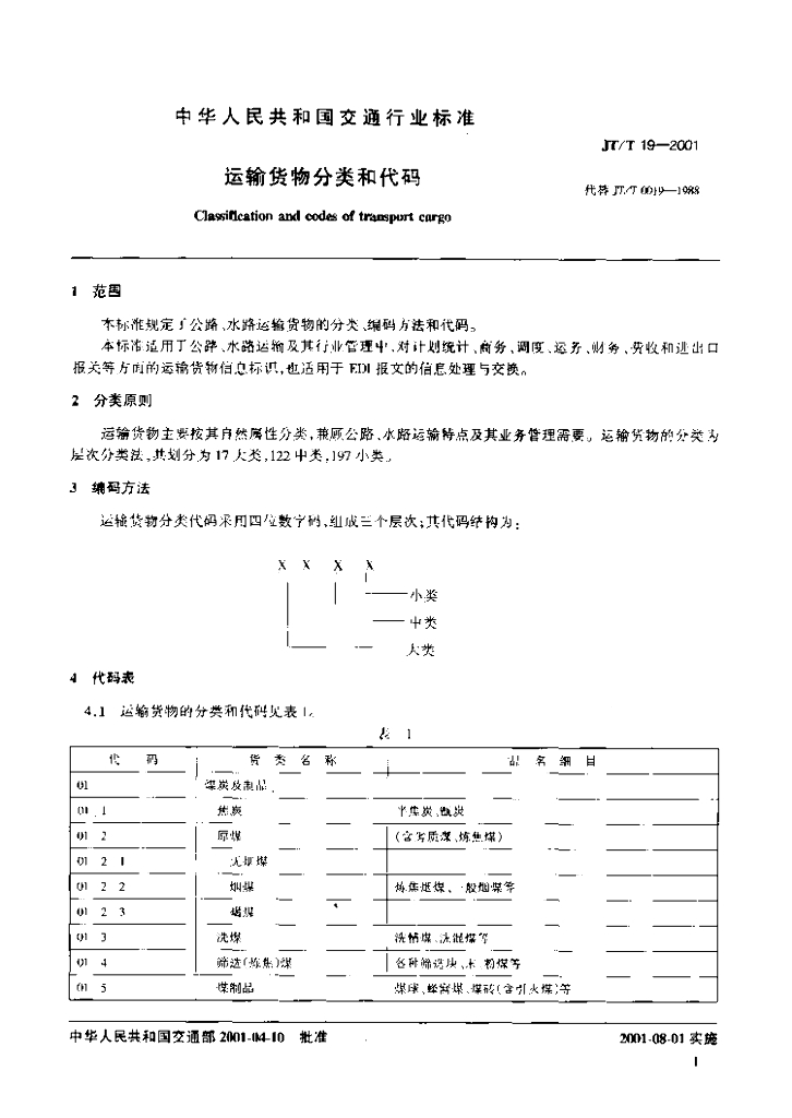JT/T 19-2001 运输货物分类和代码