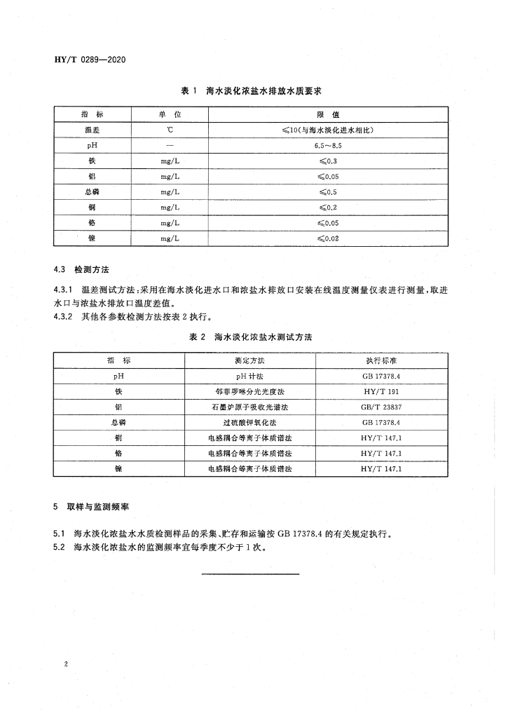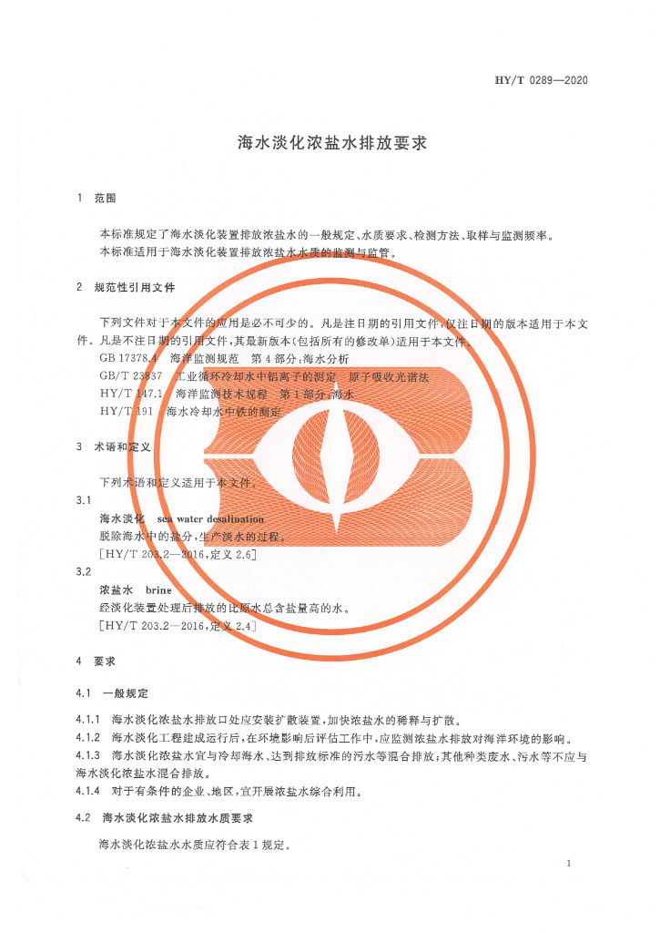 HY/T 0289-2020 海水淡化浓盐水排放要求