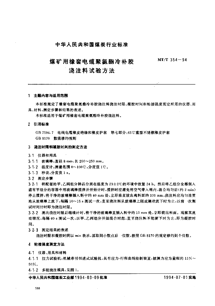 MT/T 354-1994 煤矿用橡套电缆聚氨酯冷补胶注料试验方法