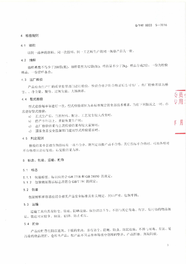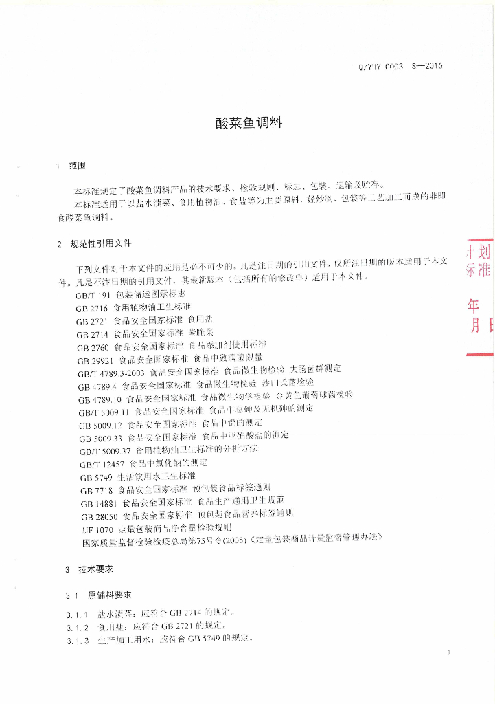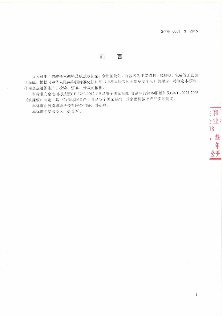 Q/YHY 0003S-2016 云南海源科技有限公司企业标准 酸菜鱼调料