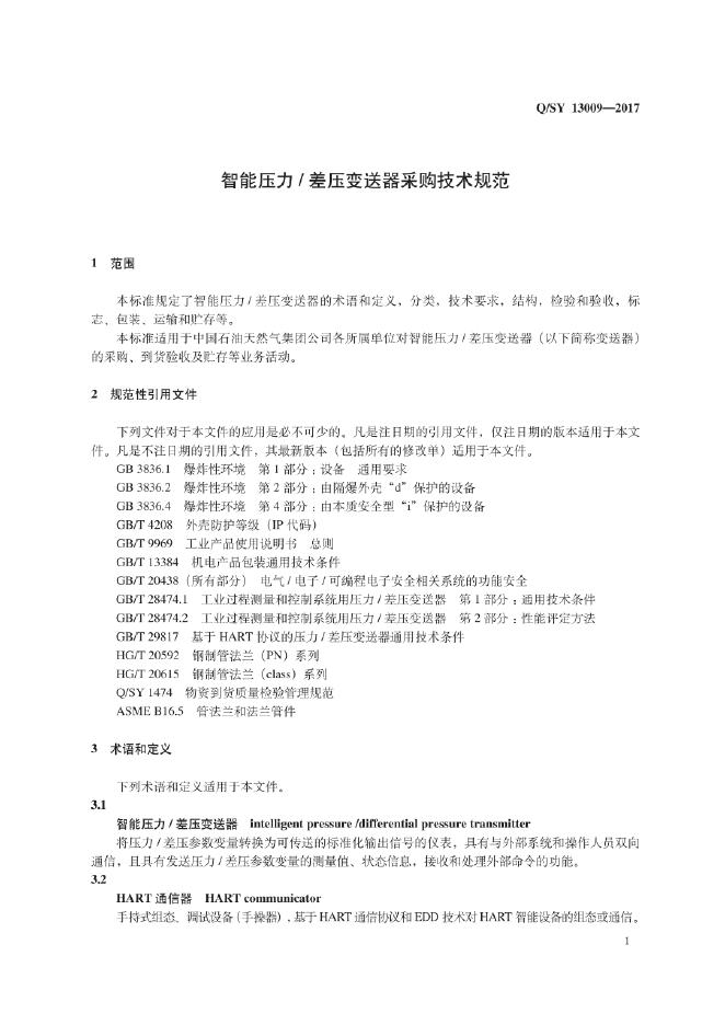 Q/SY 13009-2017 智能压力/差压变送器采购技术规范